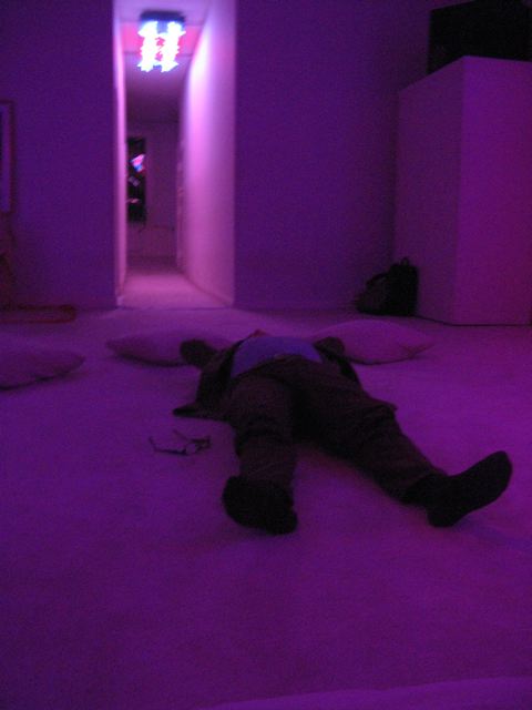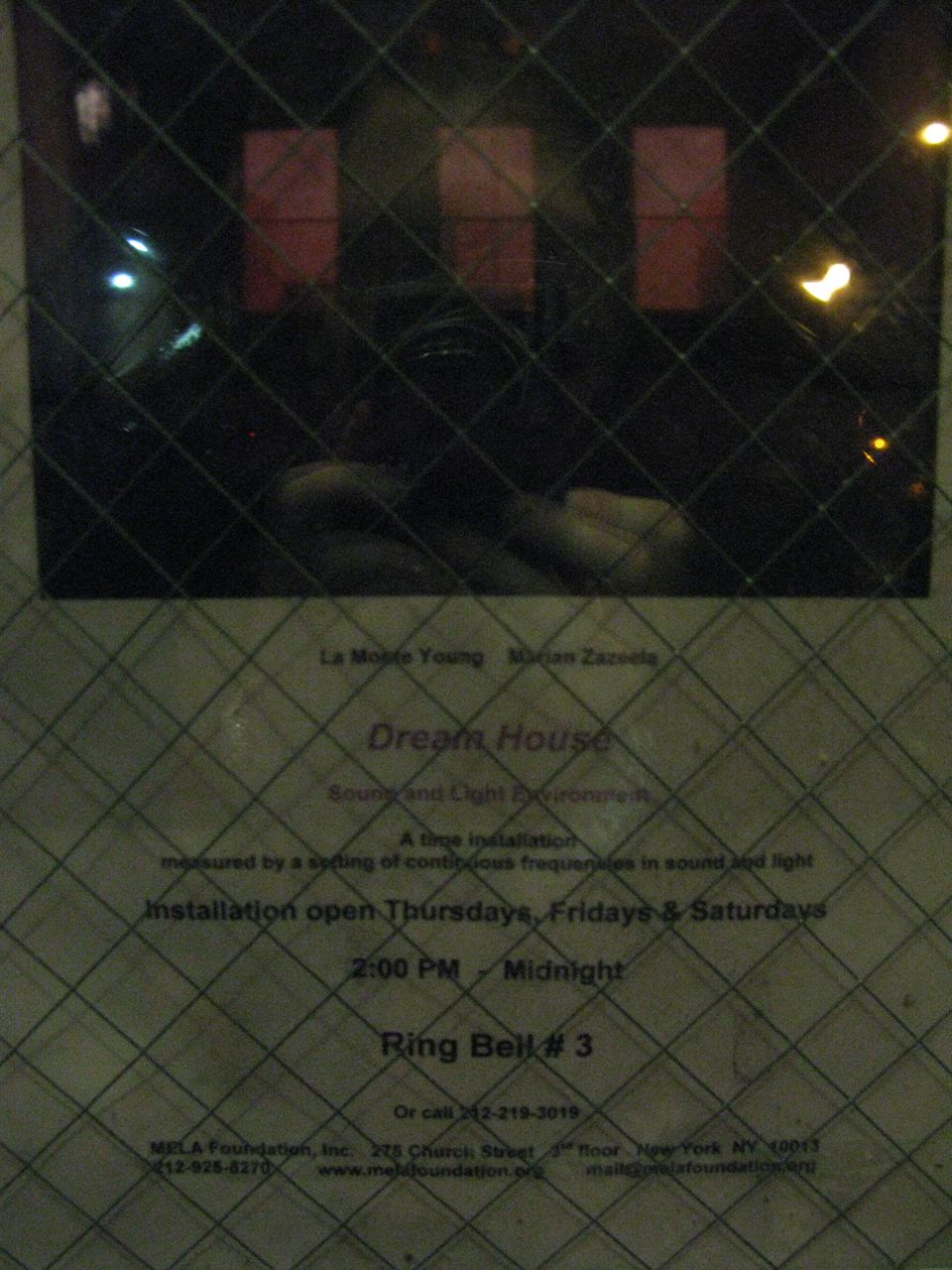 1964 schrieb er zum ersten Mal von “Dream Houses [that] will allow music which, after a year, ten years, a hundred years of constant sound, would not only be a real living organism with a life and tradition of its own, but one with a capacity to propel itself by its own momentum.” 1979 haben La Monte Young und seine Partnerin Marian Zazeela dann begonnen, ihr erstes „Dreamhouse“ zu realisieren. 1996 haben Sie eine Etage ihres Hauses 275 Church Street in einen Dreamfloor verwandelt. Dank Jo Lake haben wir die Tür gefunden und ein Volunteer ließ uns ein, nicht ohne uns über die strengen Benimmregeln aufzuklären: was so ein lebendiger Organismus ist, der will mit Respekt betreten werden. Es war dann doch zu verlockend, die Kamera ganz auszuschalten – auf eigenes Risiko, hatte der Volunteer noch gesagt und so gibt es hier ein paar wackelige Bilder von einem der lauschigsten Plätze in der Stadt.
